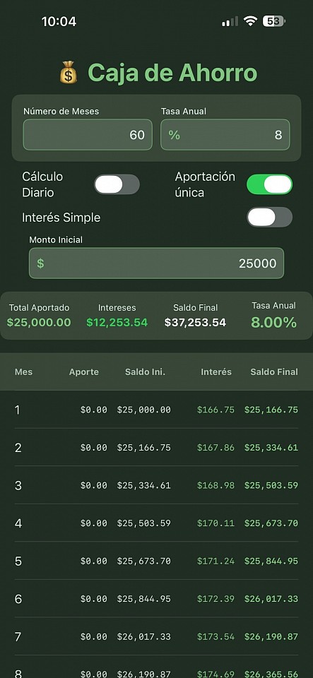 Realizar los cálculos de ahorro. Mantener las configuraciones elegidas entre sesiones.